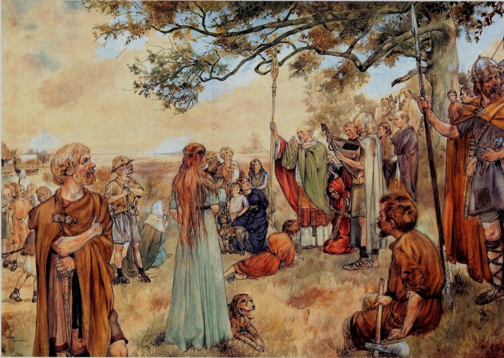 Missionarissen als Lebuinus en Liudger perbeerden de Saksen te bekeren, en mit valen en opstaon lokte dat. Disse schoeleplaete van J.H. Isings geft een indrok (‘Ludger predikt in de Groninger Gouwen, 785’).